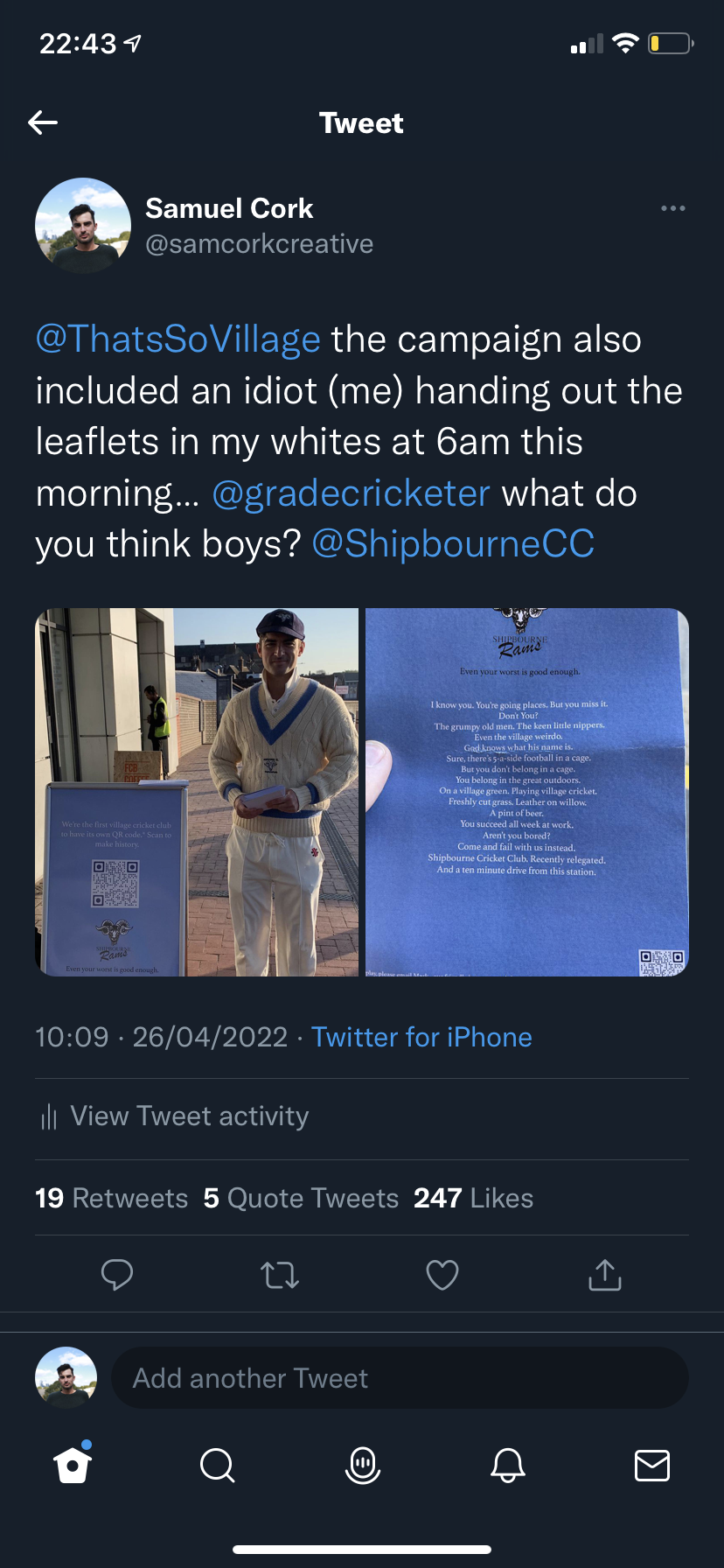Twitter-wise it’s been hard to calculate, as so much was shared without the club being tagged. However current numbers are 1,497 likes, 28 quote tweets and 65 Retweets. The BT Sports account alone has 85k followers, and Cricket District 15k. So again, twitter impressions and reach number in over 100k, with a potential reach of over 1 million.